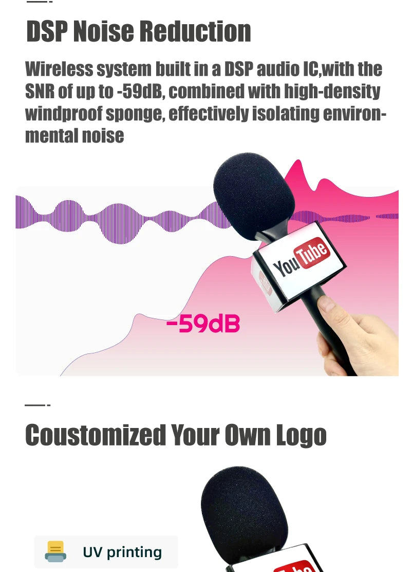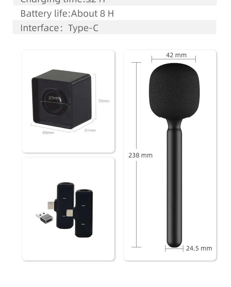 The nunavo Wireless Interview Microphone offers a convenient and efficient way to conduct interviews and record high-quality audio on-the-go. Its wireless functionality allows for seamless operation, while its detachable design makes it adaptable to various situations. The built-in DSP noise reduction system ensures clear audio even in noisy environments. With customizable UV printing(optional), you can add your own logos or designs for a personalized touch. The microphone features a Type-C interface for compatibility with most devices and boasts a long battery life of around 8 hours after a 2-hour charge.