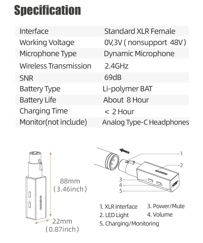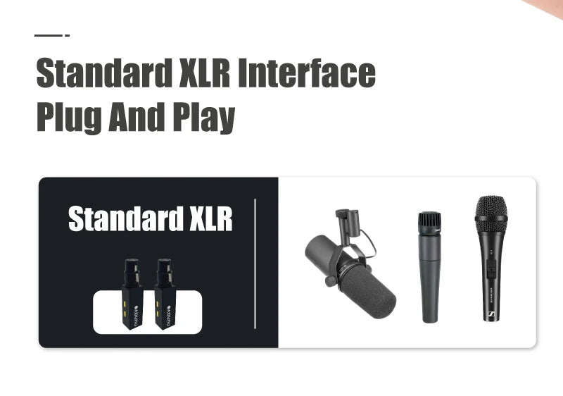 The transmitter is a standard XLR interface that can be easily installed on a dynamic microphone. Plug and play enables wireless connection with the receiver, transforming the wired microphone into a wireless one.