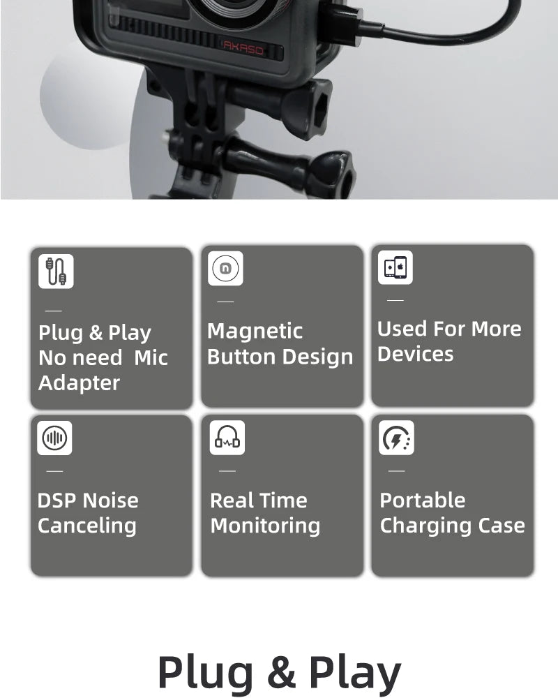 •Plug & play functionality eliminates the need for a separate mic adapter: The wireless microphone can be used to for Akaso Brave 8/7/6 plus action camera.
