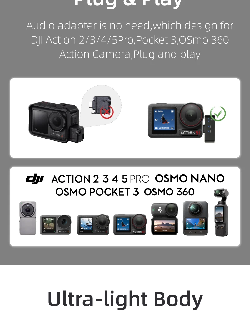•Plug & play: The wireless microphone can be used to dji osmo 360, dji osmo nano, dji pocket3, dji osmo action5 pro/4/3/2.